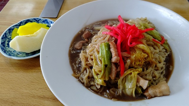 新月サンは普通にラーメン。私は〝当店名物です〟というPOPに釣られて炒めそば。