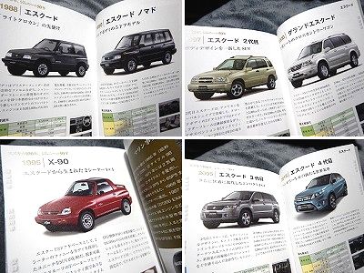 二階堂裕さんは「スズキファン、ジムニーファン、エスクードファンなら、手に取っていただければ、買いたくなる本」とアピールしております。そのエスクードは、オールエンジンの一つ前で、まあ要するに最後のチャプタ。四代目までの初期モデルと、X‐90、グランドエスクードを取り上げ、各世代内で代替わりしたモデルの記述もなされています。ラインナップ商品なんだから、載ってて当然なんですけどね、と、僕も一言余計なことをつぶやいておこうっと。