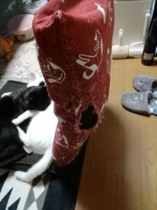 四匹全員がなぜか私の座椅子で爪とぎするので 背もたれの側面が穴開いてしまいました。 中のスポンジがあちこち転がってて、誤飲が心配。 じゃあ何かカバーでも被せればいいかと ニトリで座布団カバー買ってきて被せたら ジャストフィット♪ これで暫く大丈夫だと思ってたら、なんと 一週間もちませんでした(滝汗) さて、どおしよお・・・