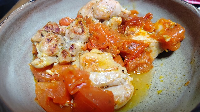 あの後また何個か赤くなったので、 (今度は幸い腐ったのは出なかった) 冷蔵庫に残ってた鶏肉を煮込んでみました。 オリーブオイルとニンニクで焦げ目つくくらい 焼いた後にぶつ切りにしたトマトを投入して 20分ほどとろ火で放置。 いい具合に味がしみて美味しく出来たわ。 (二度と同じ味では作れないけどね)