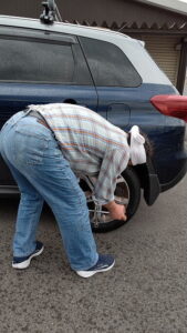 倉庫から持ってきて(会社の駐車場で取り替えたので)