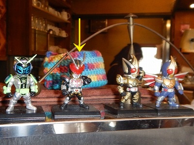 3年前に訪ねた折、店内にはジャックフォームの仮面ライダー剣となぜかウォズ(この店に現れる話は仮面ライダージオウでやってはいます)がいたのですが、先日見たら本来の下宿人であった仮面ライダーカリスが堂々といらっしゃいまた。キングフォームの剣も加わり、キッチンカフェの護りは完璧に近づいております。剣は、やっぱり白井農場が無くなってしまったからここに居候するしかないんでしょうねえ。カリスとの因縁はジオウ世界で解消しているので。