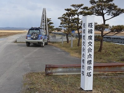 森吉山で仕事を終わらせた頃には、雪雲は東北地方を去り、明るいうちに引き上げられればアイスバーンも無いかなというくらいに天候が回復しました。現地は八郎潟にもそれほど遠くなく、あまりの寒さも手伝い、大潟村にあるポルダー潟の湯につかって暖を取った後、経度緯度公会点に立ち寄りました。