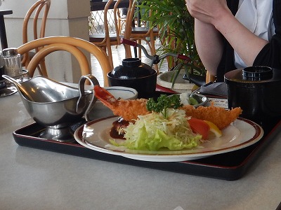 ということで、昼飯をおごってやることになるわけですが、親を前にすると遠慮がない。値段の高いBセットを頼みやがります。Aセットと何が違うかというと、エビフライが特大サイズなのです。まあいいけどさー。と、そのあと、背広姿の僕を見ながら