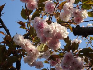 度々写真をのせていた桜がすっかり葉桜になり 替わってすぐ近くのお宅に植えてある八重桜が 満開です。 濃いピンクの種類もあるけど、やっぱり桜は この色がいいなぁ。