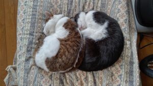 朝、私の部屋で寝てた二匹。 きれいに向きが揃っていました。 ・・・明け方まで私の布団に乗ってなかったっけ?