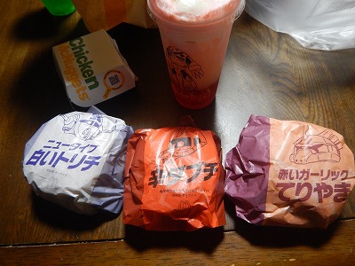 我が家の昼食に買ってこさせたものの、画竜点睛を欠いており、朝マックで出てくるダブチソーセージマフィンがありません。包み紙にはシャアの歴代乗機が描かれていますが、朝マックに行かないとズゴックが出てこない(うちの近所ではね)。霰は平然と辛ダブチを食ってましたからさほどの辛さではなさそう。赤いガーリックてりやきはソースがぼたぼたで食いにくい。ニュータイプ白いトリチは三枚パテに食い応えがあります。マックフィズは甘すぎて飲めない。