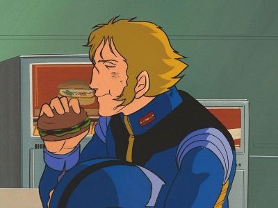 なかなかにクオリティの高い作画のCМ登場シャア・アズナブルですが、なんだってまた日本マクドナルドが「専用」便乗してきたのかはよくわかりません。なにしろファースト・ガンダムのドラマ内で、シャアがハンバーガーかじっていたかどうかなんて思い出せないもん。ただ、有名なシーンと言えば、スレッガー・ロウがソロモン攻略戦のさなか、Gファイターの補給と修理で待機中に食っているとか、Zガンダムまで通して意外にハンバーガー好きなブライト・ノアとか、なのです。