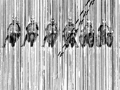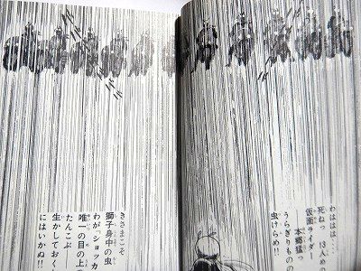 ショッカー首領は「13は死の数。貴様は13人目の仮面ライダー」だと、先行して世に出てしまった本郷猛を恫喝します。まあその割には首領自ら「仮面ライダー」と言っちゃうところがお茶目なんですが、その本郷猛とショッカー謹製同型たちとの距離感が、この雨の線描によって見開きで描かれています。同型たちだけ12人勢ぞろいのシーンがこれより数ページ前にやはり見開きでありますが、この雨中の対峙は静寂と孤独と緊張感を漂わせます。