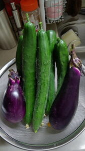 「一杯生ってるから採る」と今朝採ってくれたキュウリとナス。