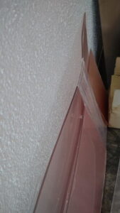 トラックの荷台でひん曲がって 売り物にならなくなった樹脂板がこちらです・・・ ま、敗因はストレッチフィルムだな。 (多分熱で収縮しちゃった)
