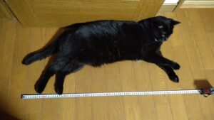 でん助さん、珍しくじっとしていたので メジャーで測ってみました。 この写真で尻尾の先から前足の先まで80cm・・・ 猫の体長は尻尾の付け根から胸までらしいので 大体・・・45cmくらいかな? 今のところ、我が家の最大値保持にゃん(笑)