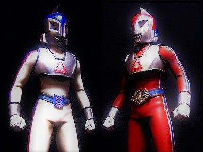 この容姿はいかにも成田亨さんのデザインワークス。ウルトラ系の宇宙人や怪獣に、なんとなく似たものが散見できますが、それらとは異なるリーグで誕生した「突撃!ヒューマン!!」の1号(左)と2号(右)です。1972年10月7日に、シナリオストーリーを持ちながら、各地のステージ上演で展開された、文字通りさすらいのヒーローでした。青と赤の裏表紙製サークル状サインが児童誌でも付録配布され、テレビの前でドラマ進行に合わせて青を回すとヒューマンがやってくる。