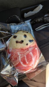 先日のSSSに向かう道中。 SAでお昼食べようかパンを買って齧りながら走るか悩んで パンを買う事に。 珍しく新月サンが買ってみる?の問いに頷いたパンがこちら。 (中身がリンゴのフィリングなので甘い) どうやって半分こするか、ちょっと悩んだわー。