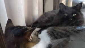 かかりつけの動物病院で飼われている猫のうちの2匹。 (多分4~5匹いる) なぜかキジトラ率高いのよねーとか、思っていたら 黒毛長がいた・・・ ふぅが居た頃は毎月のようにお世話になっていたから 頻繁に見かけていたけど、最近予防接種+αくらいしか 行かないので(本当はそれが普通)顔ぶれが 変わった事に気付かなかったわ。