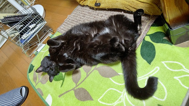 ホットカーペットの魔力に陥落した猫一体(笑) 普通に丸くなって寝ていたはずなのに ふっと気が付いたらこんな姿に。 お外暮らしの猫じゃ、絶対しないよねぇ。