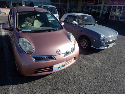 一方茨城はフェーン現象で空っ風の晴天(24日)。ちょっと遠出して年末用の買い出しに・・・買い出しだというのにフィガロで出かけちゃうのも無謀なんですが、所有者不在で車庫に置きっぱなしではバッテリー(まだ交換していない)も不安なので走らせました。すると、ありていに言えば没個性ながら、すぐにそれだとわかる、妹・吹雪のマーチが偶然にもいるではありませんか。スタッドレスも履いてないよ。