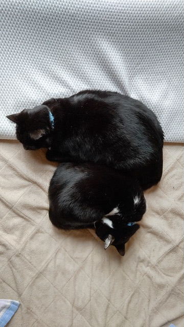 障子はずしていたので、日中はずっと 日が当たっていたと思われる場所で寝る にーちゃんず二匹。 もう気温も下がってきたでしょうよ。 ま、自分たちの体温で温かいのか・・・