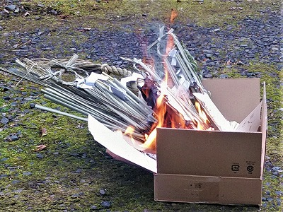 でもってほんとにスーパーヒーロータイムなど見ている場合ではなく、昨年一年間祀ったお札やら飾ったごぼう締めやら正月飾りやらを外して、どんと焼きというかお炊き上げをしておりました。
