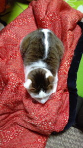永らくクローゼットにしまい込んでいた半纏。 少し前の寒波の時に出してみました。 洗い物するのでちょっと脱いで置いたら はなに取られた・・・