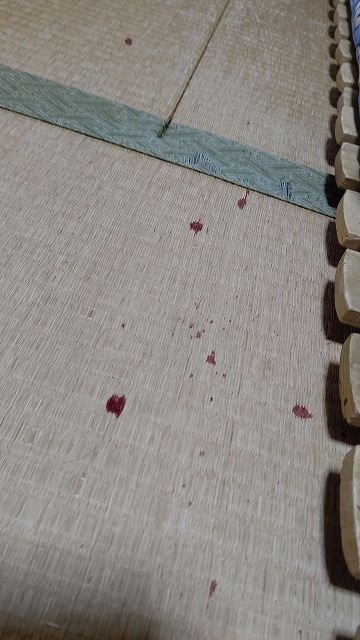 帰宅して、寝室の雨戸閉めに二階に行った新月サンが 「あ゛~~~~~っ!!!」 と絶叫。 またいつものゲ〇か・・・と思って放っといたら駆け下りてきて 「血っ!血っ!血しぶきっ!」 はあ??? 見に行ったら、畳の上とかシーツの上とか壁とか、 いたる所に点々と血が垂れてました。 慌てて4匹捕まえて身体中見たけど、怪我してないし? なにより帰宅した時点で4匹とも普段通りだったし?? 何があったのよ一体・・・