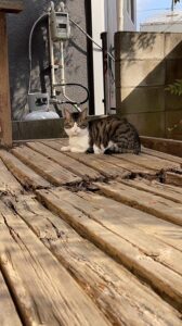 義弟宅の〝元〟ウッドデッキにて。 義妹が出掛けようかと表に行ったら 寝そべっていたらしい。 「見た事ないコなんだよねー」と義妹が言うと 新月サンは「近所で見た事あるよ?」と一言。 まあその近所っていうのも、区画で2ブロックくらい 離れた場所なんですけどね。