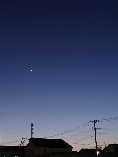 暫く前から日没後の西の空で並んで光っている木星と金星。 ふと思いついて撮ってみたけど、コンデジではこれが限界でした。 月と三つ並んでいた時に三脚立てて撮るべきだったかな? その時は撮ろうと思わなかった天邪鬼・・・