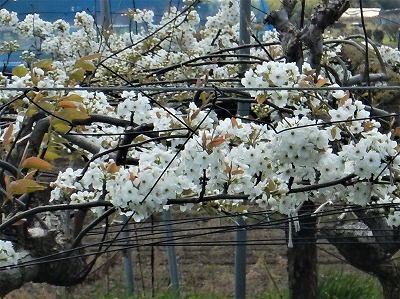基地周辺ではソメイヨシノも葉桜になり、梨の花がピークの終盤。梨も花の密度が高くて白が生えます。咲いている時間はとても短く、ぱっと落花して果樹園に花の絨毯が敷き詰められますが、農家の仕事も速くてあっという間に片づけられてしまうのでなかなかお目にかかれません。