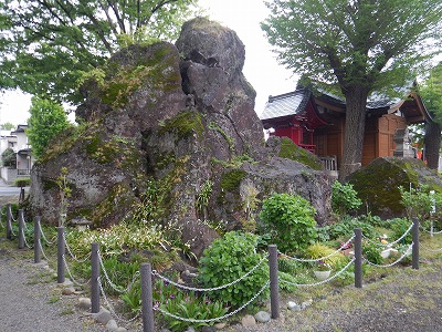 境内を訪ねると簡単な解説がありました。10万年前に活動開始した黒斑山という火山が長野県と群馬県の県境にあって、これが36000年前に噴火した際の溶岩塊だそうで、26000年ほど前に山体崩壊してカルデラを持つ浅間山の形が出来上がり、その際の泥流が吾妻川、利根川を経由して前橋まで流れ込み、この溶岩塊もそれに乗って漂着したものだとか。黒斑山の部分は解説にはありませんが、浅間山の最高峰のことです。