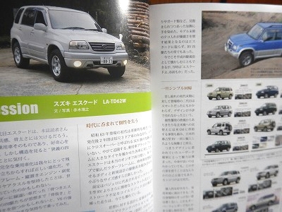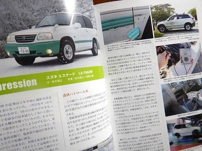 ところで今号、TD62Wで8ページ、TA02Wで13ページ、TL52Wで3ページというウルトラスーパーデラックスな構成。しかも巻頭からずーっと二代目エスクードのインプレッションです。ここまでワイド特集してくれるとは思わなかった。我々目線で言いたいことは一点。62Wの燃費がリッター6くらいという表記ですが、二代目はすべからくタイヤサイズを初代規格に変更していけば、そんな悪い数値にはならないよ、と。