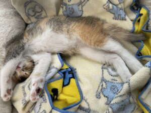 目出度く義弟んちのコになった三毛ちゃん。 〝ミミ〟という名前をもらいました。 猫じゃらしで大暴れした後は写真のように爆睡・・・ 最初にシャーシャー威嚇してたのはどこの誰だよ(笑)