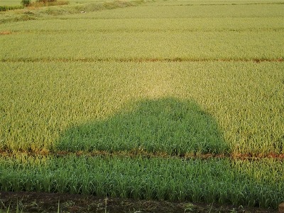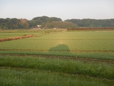 ちょうど霞ケ浦の湖面対岸から太陽が昇ってきたころで、太陽光と水田の間に車がいて影を落としたことが、これの原因なわけですが、これで車のまわりに後光でも展開していたらブロッケン現象だったんでしょうけど、低湿度で霧や靄なんかかかるような朝ではありませんでした。