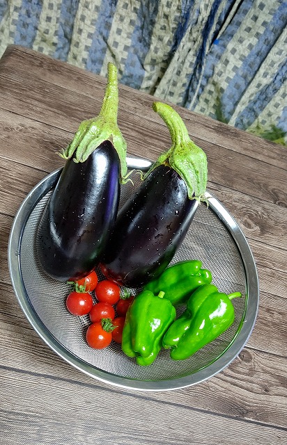 暑けりゃ暑いほどよく育つのかしら・・・ 再びのナスとピーマン収穫。 先日のプチトマトも無事赤くなったので 美味しく頂きました。