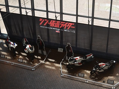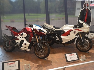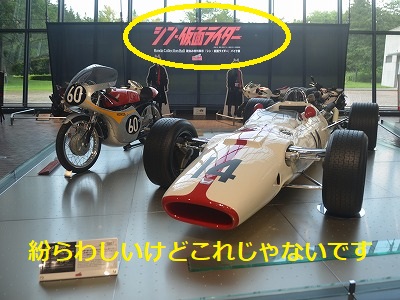 上の紛らわしくわざとらしいカットでもうお解りかと思いますが、なんでまたこの時期にもてぎまで足を運んだかと言えば、「シン・仮面ライダー」に登場した3種類4台のサイクロンが一堂に会しているからです。夏休み真っ盛りだから下手な時に出かけたら人だかりで近寄れんかもと思ったんですが、そこは平日(おい)、ホンダコレクションホールは入場者もまばらでインバウンドのアベックばかり。サイクロンなんかに興味を示す人はいません。