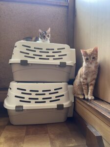 4ヶ月も過ぎましたので、避妊手術を予約された二匹。 義妹が用意したバスケットにちょっかい出してますが・・・ 麻酔かけるから前夜から断食&水絶ち。 とは言っても、ほっといたらお勝手の流しやら お風呂の洗い場やら舐めはじめたので、夜は少し 水飲ませたらしいですが。