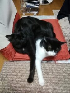 寒かったのか、ピッタリくっつくでんいち。 でんが大きいから二匹でみちみちの座椅子(笑) 仲良き事は良いのだが、座椅子返して・・・