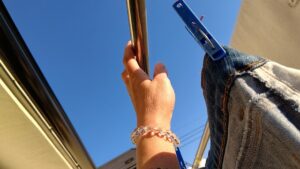 ベランダの防水塗装が終了して、 洗濯物が干しやすくなった! なぜならば嵩上げされたから(笑) 基礎組んでパネル貼って防水シート貼って。 この段階で7~8cmは高くなったはず。 物干し竿拭くのに背伸びしないと届かなかったけど、 普通に手が届く喜び。背が高い人には判るまい。 そして多分、新月サンは竿に頭当たります。