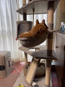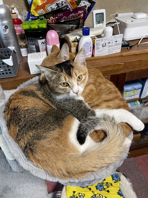 チャチャ・ミミ、相変わらず仲良しこよし。 9月の時点で(ぱつぱつ)既に傾いでた キャットタワーのハンモックで昼寝。 チャチャのお気に入りで入って寝てると ミミが上に乗ってそのまま寝るらしい。 折れる前に何とかしてー。