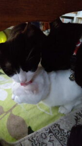 昼間家に戻ったら玄関に出てきた・・・ゆき? なんだその薄黒く汚れた頭はっ!! よくみたら左のほっぺも汚れてた。 煤でも擦ったような汚れ方なんだけど 家の中のどこでそんな汚れを??? (どれだけ家が汚いのかって話なんだが) その後にーちゃんず二匹掛かりでせっせと 毛づくろいしてました。 ・・・仲がいいのか悪いのかホント判らん・・・