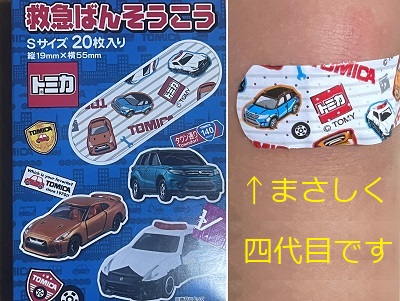 トミカブランドのエイドグッズがあるということを僕も知りませんでした。スケーターという会社が扱っているそうです。まあねー、娘らにミニカー買ってやることなんか無かったものなあ。その昔、霰の肌着を買いに西松屋に出かけたとき、初めてプラーゴの初代ミニカーを見つけ、これが沢山あって買い占めたのは、自分のためでしたし。