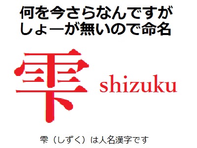 とかいう対話があったりなかったりで、ここにきて改名です。我が家のルールに従い、「空からやって来るもの」は踏襲しております(雫となると、空からとは限らない気もしますが)。ついでに言うと、SIZUKUはSUZUKIのアナグラムなんですがそれを言ったら本当に殴られるので「H」を入れてあります。