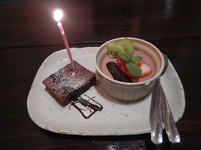 というわけで当日昼には夫婦水入らずで近所のイタリアンな寿司屋にて「多くは突っ込まないでねの」お祝いしたんですが、お店の大将のはからいでコース料理の締めくくりに出てくるデザートが、いつものパンナコッタに一品追加していただけていました。