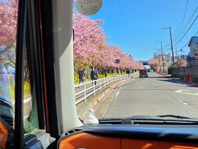 菜の花と河津桜と青空のコントラストに、蓮田さんのオレンジが良い感じで映えております。あー、花見の季節が近づいているなあ。