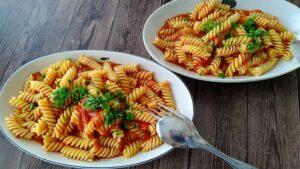 休日のお昼ご飯の話ですが。 正月休みに実家にあいさつに行ったら コストコで5kg入りの大袋を買ってしまい 扱いに困ってた義姉からお裾分けされた ショートパスタ茹でました。 くるくるしてるので、トマトソースが合う! 思い付きで作った成功例でした(笑)