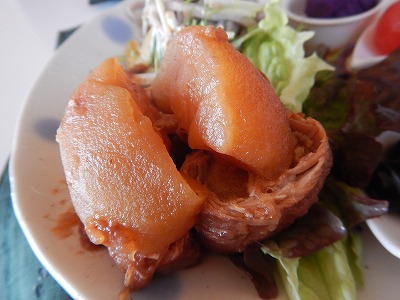 このランチの全てがとまでは言いませんが(ちょっとショウガ風味が強いものもありでそこが僕だけ残念)、どの料理もおいしい。塩むすびの塩加減は僕だけでも絶賛。献立構成を見て、おそらく常連客は女性主体と思われますがランチ自体はなかなかのボリュームです。なかでもこれを食いたかったというやつが「リンゴの肉巻き」←目から鱗。ここまで柔らかく煮込んで型崩れさせないばかりか、こちらのショウガ風味は絶妙です。「モン・リヴル」で出逢ったまさしく琥珀の逸品。