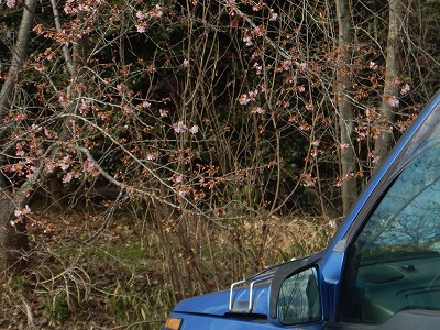 店主の親切な説明で予約はできたものの、駐車スペースが3台分しかないということも聞かされ、これはもう開店と同時に訪ねるしかないなと夫婦で出かけてみれば、この辺りではランチ時間は実際のお昼時以降がピークらしく、開店時刻は一番乗りでした。でもってこここういう具合に停めれば後の車も倣うだろうし(あとから来た1台はそんなことお構いなしの停め方をしやがった)4台はいけるぞと隅っこに駐車すれば目の前に河津桜が咲いておりました。