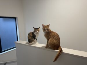 階段の手すり(?)に佇むミミ・チャチャ。 リビングにある明かり取りの高窓からずりこけて 早々に壁紙を引き裂いたり、やらかし始めたみたい。 日中は飼い主夫婦のベッド占拠して寝こけてるとか? まあ、馴染んで良かったという事で。