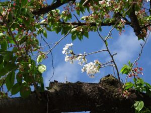 先週末の馬鹿陽気とその後の強風で 散る花弁も無いほどの桜。いっそ潔いかも・・・ と思って眺めていたら、三つ又に伸びている 幹に囲まれた真中辺りに一枝咲いてました。 また来年だね。