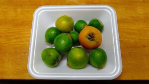 折角色付き始めたのに、台風並みの風にあおられて コンクリートに叩きつけられた衝撃で落果。 楽しみにしてたのにぃ・・・シクシク