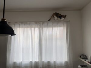 キャットタワーからカーテンレールに飛び乗って 進んだはいいけど降りられなくなったミミ。 この後義妹が踏台持ってきて抱き下ろしたそうです。 うちのは後ずさったけどねぇ。 あ、ゆきはカーテンばりばり言わせながら ずり下りてきたか・・・(新品でそれはイヤだよね)